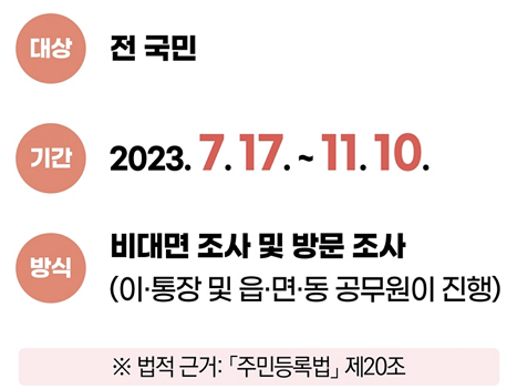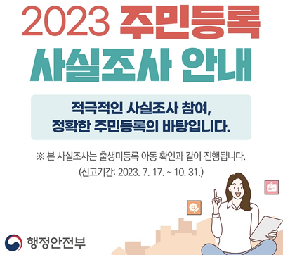 2023년 주민등록 사실조사는 주민등록증과 실제거주지가 동일한지 조사해서 관련기관과 공유하여 복지나 교육등 여러 정책수립에 활용하기 위함입니다. 비대면은 8월 20일까지였으나 시스템오류로 하루가 연장된 8월 21일까지이며 22일부터는 관할 공무원이 직접 방문하여 조사합니다.