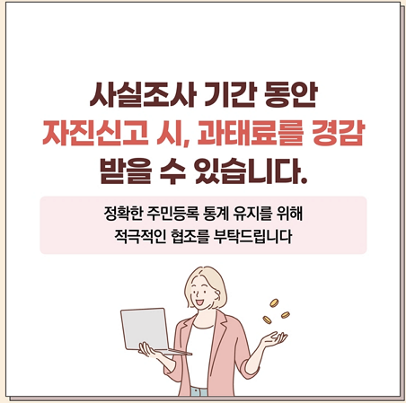 1~2분이면 비대면 참여가 가능하니 놓치지 말고 지금 당장 참여해서 최대 50만 원 과태료를 내는 일이 없도록 합니다. 개인적인 일로 주민등록사실조사에 참여를 못했더라도 사실조사기간 안에 자진신고를 하면 최대 80%까지 과태료를 감면받을 수 있으니 주민등록사실조사에 늦었더라도 자진신고하여 과태료를 감면받으시길 바랍니다.