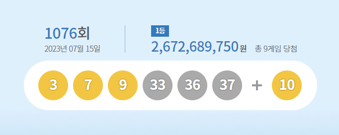 1076회 로또당첨번호는 3,7,9,33,36,37, 보너스번호 10번입니다.